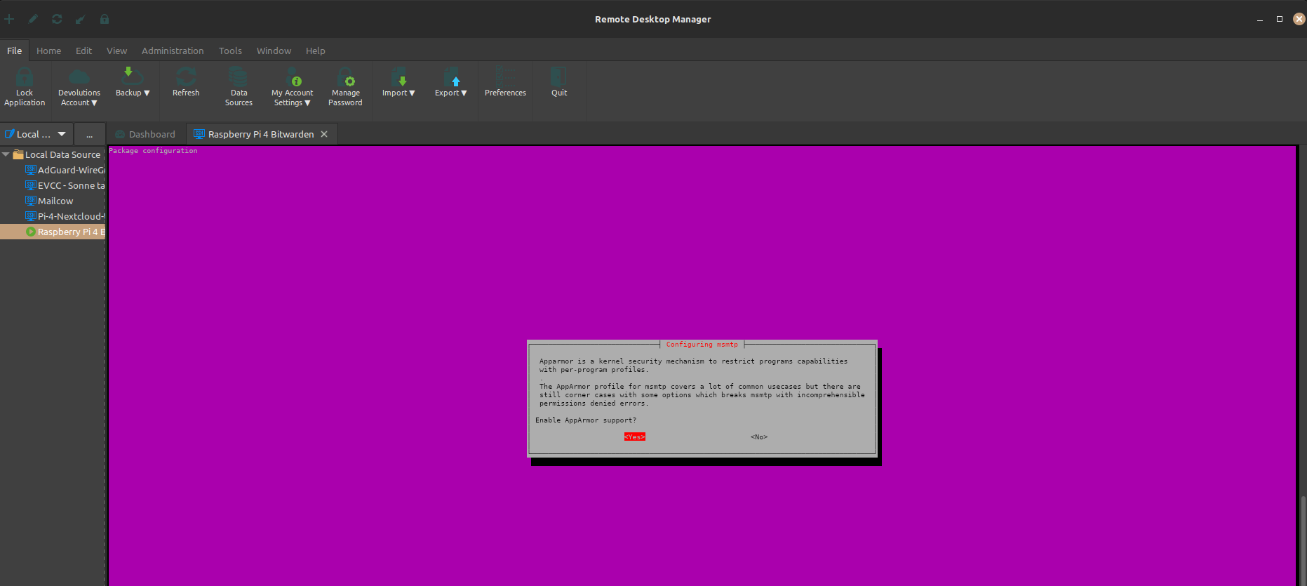 Während der Installation erscheint ein lila Fenster mit einer AppArmor-Bestätigungsabfrage. Wählen Sie hier Yes aus, um fortzufahren. Dadurch wird eine zusätzliche Sicherheitsschicht aktiviert, die die Systemressourcen besser schützt.