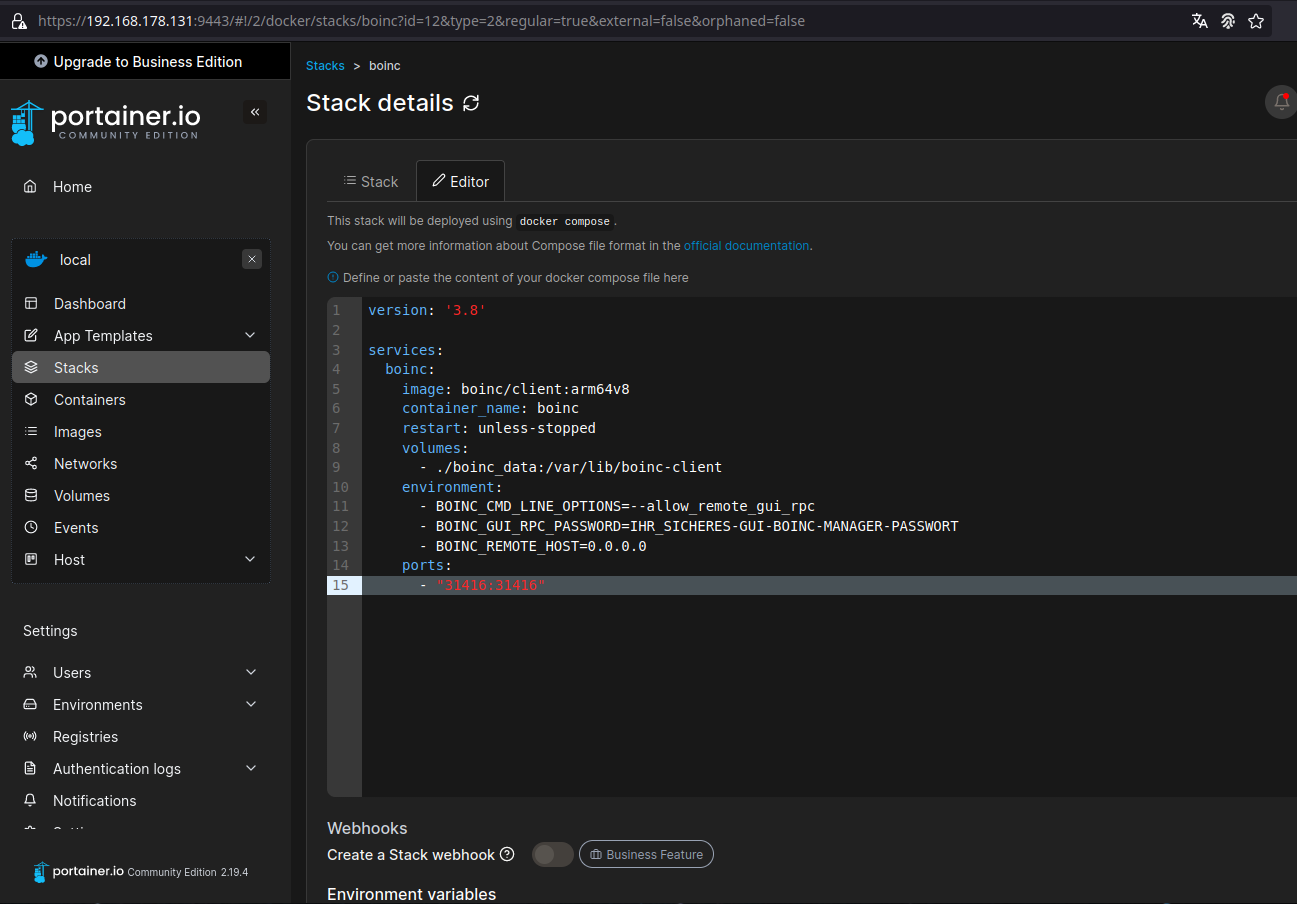 4. Stack deployen: Nachdem Sie den Code eingefügt haben, klicken Sie auf „Deploy the stack“. Portainer wird den Docker Compose-Prozess automatisch handhaben und den BOINC-Client als Docker-Container auf Ihrem Raspberry Pi starten.