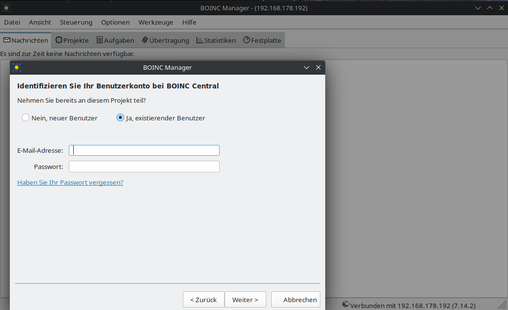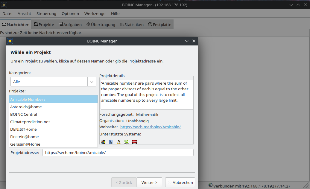 - Projekte in BOINC hinzufügen: Beim erstmaligen Starten des BOINC-Manager Clients erscheint ein Fenster zur Projektauswahl, welches Sie schließen können. Bestätigen Sie die Rückfrage, ob Sie den Vorgang wirklich abbrechen möchten, mit „Ja“. Anschließend stellen Sie die Verbindung zu Ihrem Raspberry Pi her. Gehen Sie dazu auf „Datei“ > „Computer auswählen“ und geben Sie die lokale IP-Adresse Ihres Raspberry Pi sowie das Passwort (IHR_SICHERES-GUI-BOINC-MANAGER-PASSWORT) ein, das Sie zuvor im Docker Compose-Code festgelegt haben um Zugriff auf die BOINC-Manager-GUI zu erhalten.