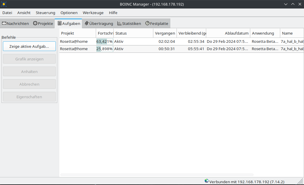 Im folgenden Bild sehen wir den BOINC Manager in Aktion, der auf einem Raspberry Pi läuft. Der Screenshot zeigt die Benutzeroberfläche mit einer Liste aktiver Aufgaben, die gerade von Rosetta@home bearbeitet werden. Die Aufgaben sind detailliert mit Informationen zu Fortschritt, Status, vergangener Zeit sowie der verbleibenden Schätzung aufgeführt.