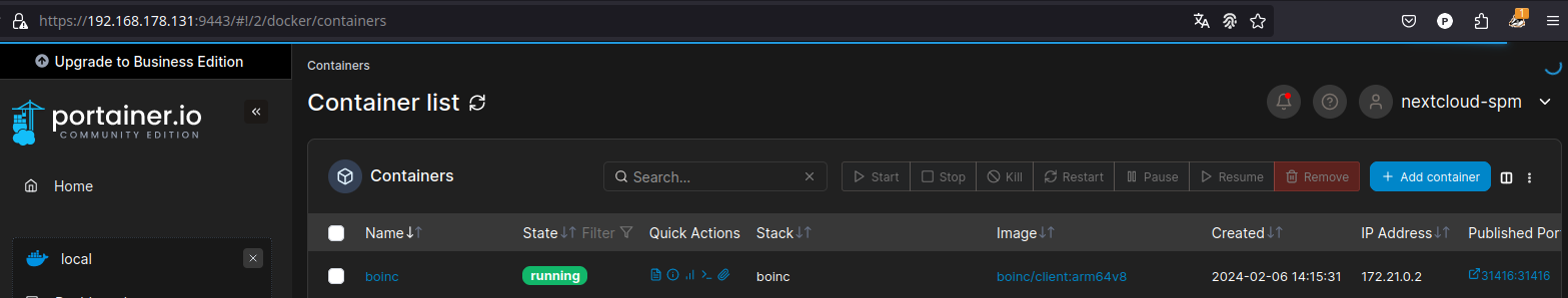 Über den BOINC Manager können Sie Ihre Beiträge überwachen, Einstellungen anpassen und die Fortschritte Ihrer Projekte sehen. Portainer bietet Ihnen Einblicke in den Container selbst, ermöglicht das Neustarten und Überprüfen von Logs.