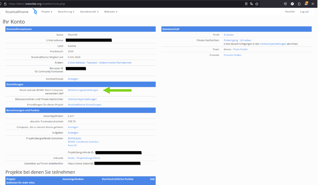 Loginseite von rosetta@home und Aufruf der Kontoeinstellungen