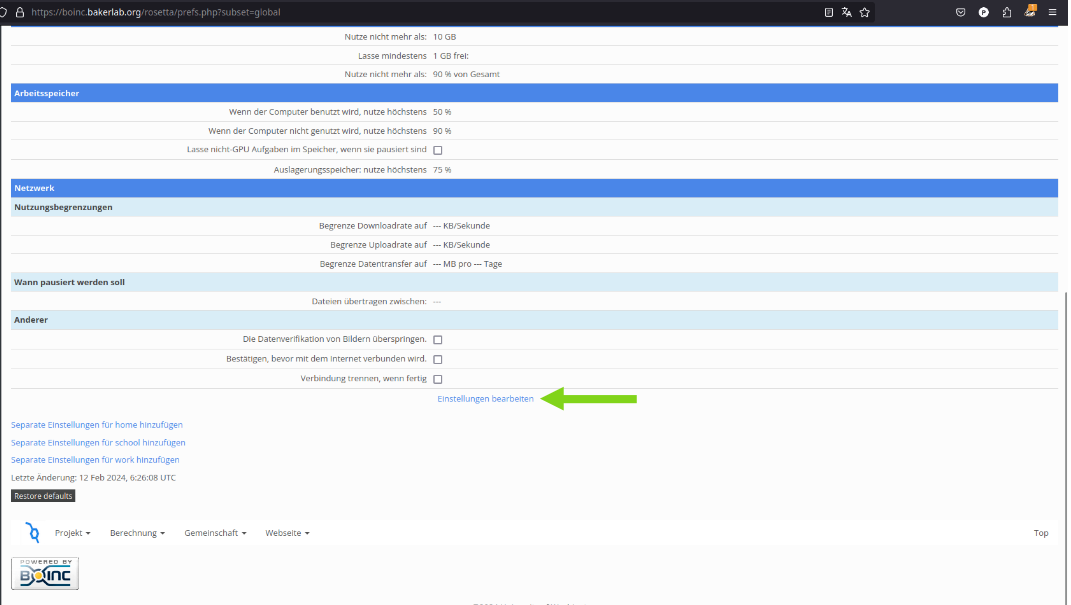 In den Berechnungseinstellungen auf der BOINC-Webseite, die Sie im nachfolgenden Screenshot sehen, gibt es einen Bereich „Andere“, wo Sie zusätzliche Einstellungen vornehmen können. Über den Button „Einstellungen bearbeiten“, der durch den grünen Pfeil markiert ist, können Sie in das Menü gelangen, um diese Anpassungen vorzunehmen.