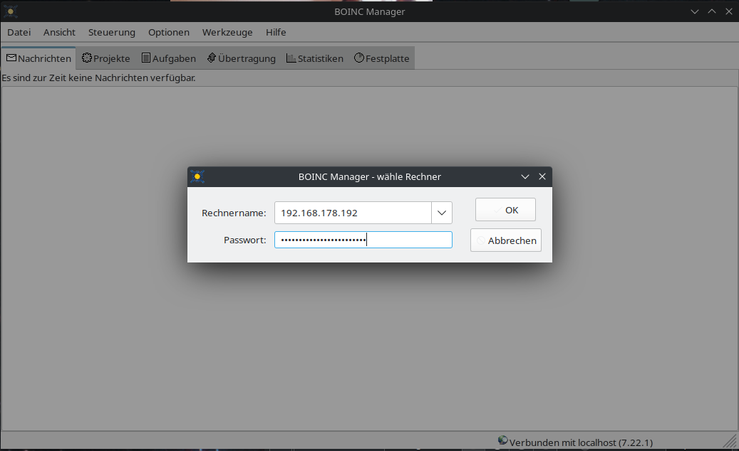 Wenn Sie den BOINC-Client aus der Ferne oder von einem anderen Gerät in Ihrem Netzwerk aus steuern möchten, müssen Sie dieses Passwort im BOINC Manager angeben, um eine Verbindung herzustellen. Es dient als Authentifizierungsnachweis, der sicherstellt, dass nur Benutzer mit dem korrekten Passwort den BOINC-Client konfigurieren oder überwachen können.