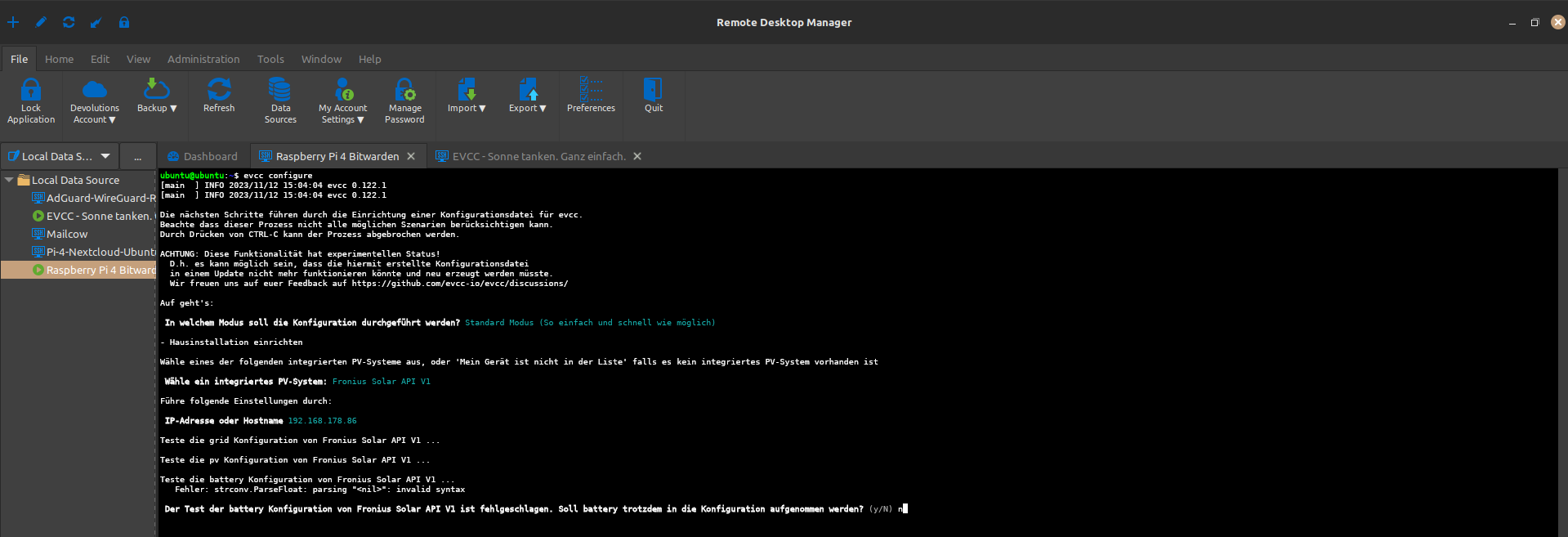 Anschließend werden einige Konfigurationstests durchgeführt. Da ich keinen Batteriespeicher habe, wird mir eine diesbezügliche Fehlermeldung angezeigt. Folglich übernehme ich die Konfiguration nicht mit in meine evcc.yaml auf.