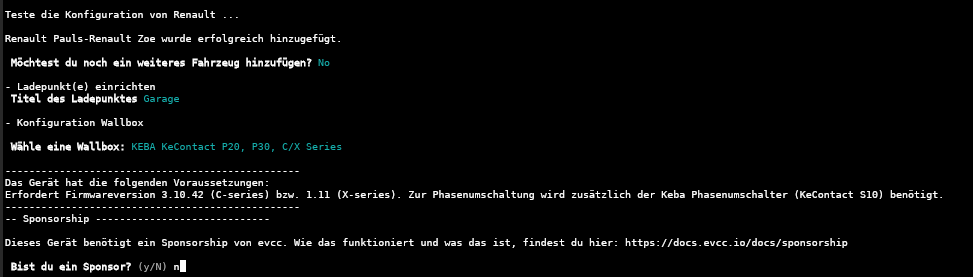Wenn Sie ein weiteres Fahrzeug hinzufügen möchten, dann bestötigen Sie die nächste Frage „Möchtest du noch ein weiteres Fahrzeug hinzufügen?“ mit y. Falls nicht, kommen wir zur Konfiguration der Ladepunkte, sprich der Wallbox bzw. wenn Sie mehrere haben können Sie hier gleich alle weiteren Wallboxen konfigurieren. Wichtig: Für manche Wallboxen ist ein Sponsortoken erforderlich um das Projekt zu unterstützen.