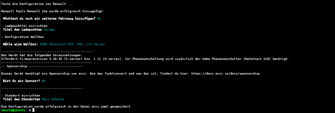 In EVCC gibt es einen Konfigurationsassistenten für die Erstellung der EVCC Konfigurationsdatei welcher mit dem folgenden Befehl im Terminal aufgerufen wird: