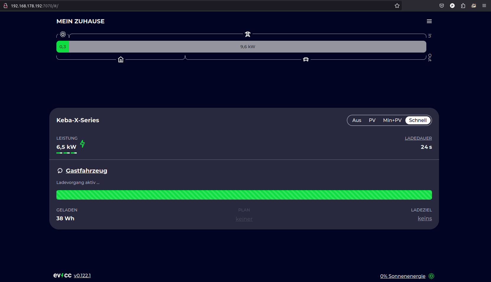 Öffnen Sie anschließend einen Webbrowser und geben Sie die lokale IP-Adresse Ihres EVCC-Servers, welche der lokalen IP-Adresse Ihres Raspberry Pi’s entspricht in Verbindung mit dem Port 7070 ein, um auf das EVCC-Dashboard zuzugreifen.