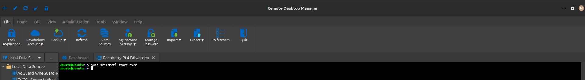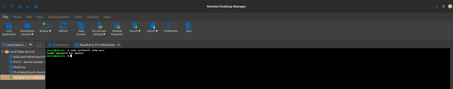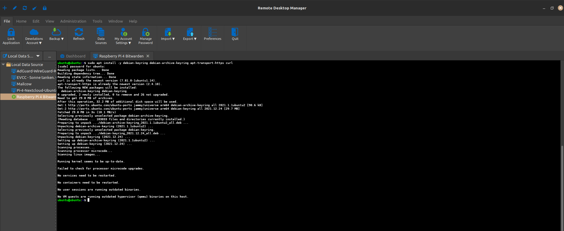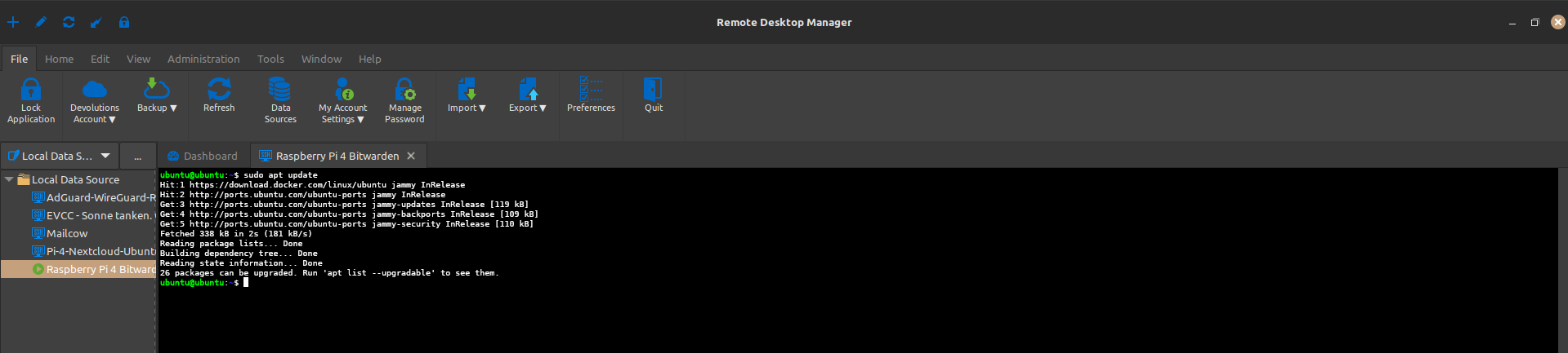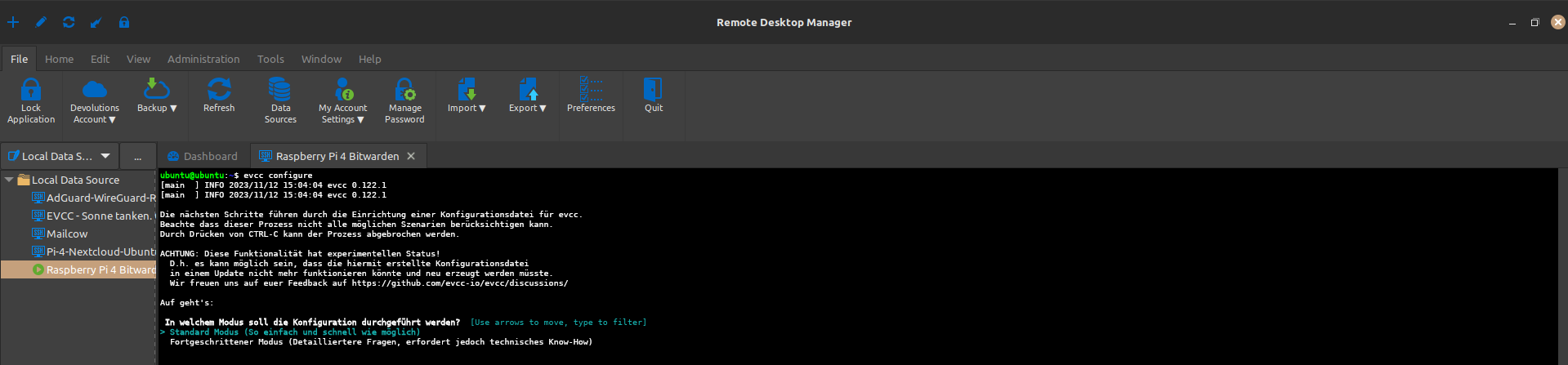 Stellen Sie über den Remote-Desktop-Manager (oder eine andere SSH Anwendung wie Putty oder nur über das Terminal/Eingabeaufforderung mit der SSH-Syntax bspw. Benutzer@IP + Passwort) eine SSH-Verbindung zu Ihrem Raspberry Pi her.
