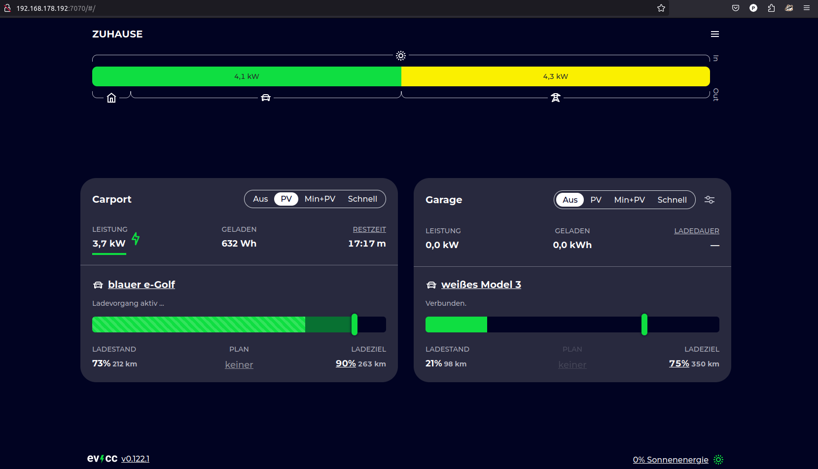Öffnen Sie nun Ihren Browser und navigieren Sie zur EVCC-Dasboard Oberfläche mit: um zu sehen, das nun Ihre Geräte erfolgreich eingebunden sind: